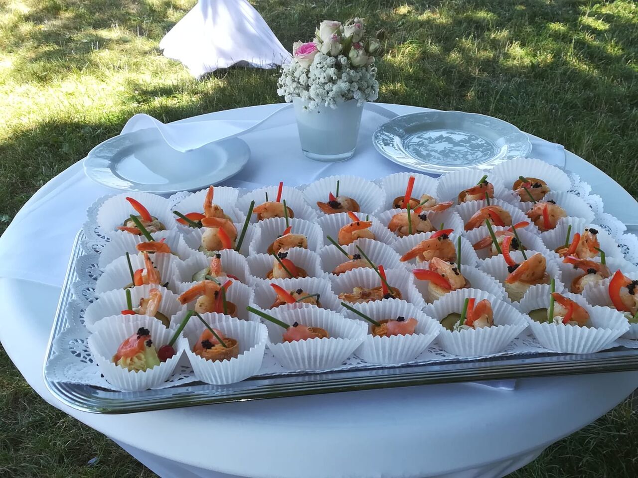 Neben den obligatorischen Sekt gibt es auch Häppchen für die Gäste, die den Hunger stillen und gleichzeitig den Appetit anregen.